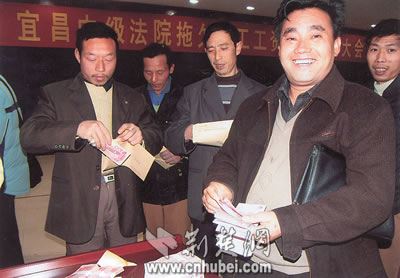 2004年12月22日,民工在宜昌中級(jí)法院領(lǐng)取執(zhí)行回的工錢。