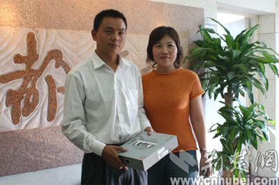 楚天都市報(bào)副總編輯費(fèi)力(右)給荊州的劉先生(左)頒獎(jiǎng)