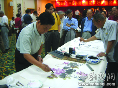 昨日,來(lái)自中、日、新、韓四國(guó)共26名書(shū)畫(huà)大家在游覽三峽后,紛紛揮毫潑墨,并與宜昌本土?xí)?huà)家進(jìn)行了交流。據(jù)了解,此次四國(guó)書(shū)畫(huà)家友好聯(lián)盟大型筆會(huì)活動(dòng),是由宜昌市政協(xié)、宜昌點(diǎn)軍區(qū)政府和宜昌環(huán)中房地產(chǎn)開(kāi)發(fā)有限公司、宜昌環(huán)中旅游開(kāi)發(fā)有限公司共同舉辦的。荊楚網(wǎng)楚天都市報(bào)記者梅曉蕓攝