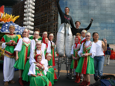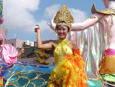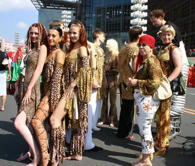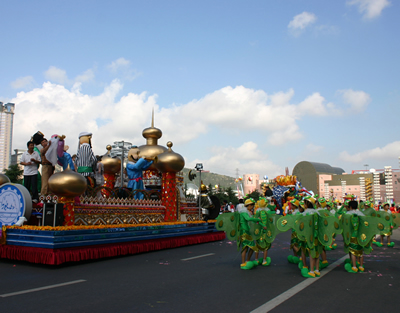 今天上午在新海廣場舉行的第六屆大連狂歡節(jié),更是使歡樂的海洋里掀起了歡樂的海潮。來自國內(nèi)外的24支狂歡巡游隊伍,以花團(tuán)錦簇的民族服裝和極度夸張的藝術(shù)手法,演繹了航天、花神、特洛伊木馬、梁山伯與祝英臺、孔雀仙子、海底動物、蝴蝶服飾、阿凡提、醉酒、美人魚、回娘家、貓友、豪華游覽馬車、日月潭傳說、堂吉訶德、木偶奇遇、狐假虎威、寶蓮燈、海娃與王子、小櫻丸子、尼爾斯騎鵝記、阿里巴巴、輪滑表演等國內(nèi)外著名童話,電影故事等。最為耀眼的是以音樂劇《貓》的扮相出場的表演隊伍,他們獨特的表演和造型贏得了在場觀眾最多的歡呼聲。狂歡的服裝藝術(shù)巡游,吸引了數(shù)萬國內(nèi)外游客和當(dāng)?shù)孛癖姷挠^賞。