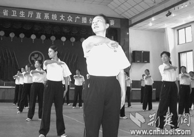 昨日下午,湖北省衛(wèi)生系統(tǒng)直屬11家醫(yī)院派出代表隊,參加全省舉辦的第九套廣播體操比賽。據(jù)介紹,新體操在傳統(tǒng)廣播體操的基礎(chǔ)上,引入了武術(shù)、踢毽等元素,可有利促進全身循環(huán)、精神傳導(dǎo)等。圖為省腫瘤醫(yī)院代表隊在表演。