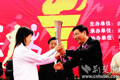 昨日8時30分許,硚口體育廣場彩旗飄揚(yáng)、鑼鼓喧天。省委常委、武漢市委書記苗圩點(diǎn)燃武漢市第七屆運(yùn)動會火種,交由奧運(yùn)冠軍喬紅引燃各區(qū)火炬,領(lǐng)跑該市近5000人的火炬大傳遞。
