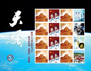 這套反映神六主題的個性化郵票為8枚版式個性化郵票,每版的副票圖案,有4張為航天員費俊龍與聶海勝的兩人合影,其他4張圖案分別為出征、運行、細(xì)胞實驗、勝利歸來,主票圖案為長城。