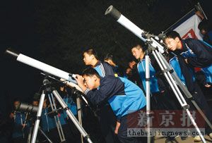 13日凌晨6時,平谷一中學(xué)的天文愛好者使用天文望遠(yuǎn)鏡等待神六出現(xiàn)。