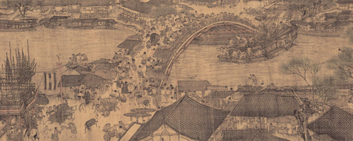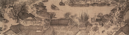 北宋京城汴梁及汴河兩岸的繁華和熱鬧的景象和優(yōu)美的自然風(fēng)光。作品以長(zhǎng)卷形式,采用散點(diǎn)透視的構(gòu)圖法,將繁雜的景物納入統(tǒng)一而富于變化的畫卷中,畫中人物500多人,衣著不同,神情各異,栩栩如生,其間還穿插各種活動(dòng),注重情節(jié),構(gòu)圖疏密有致,富有節(jié)奏感和韻律的變化,筆墨章法都很巧妙,頗見(jiàn)功底。