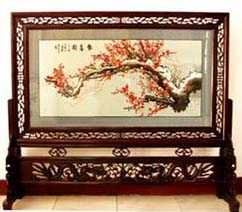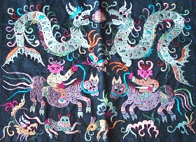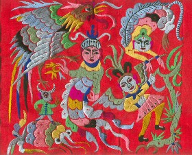 苗繡 刺繡,是苗族婦女盛裝不可或缺的飾物,主要有領(lǐng)花、肩花、襟花、背塊花、袖口花、裙鑲花、帽頂花、帽頂花等品種。苗族刺繡,整體上多為幾何構(gòu)圖,古樸多姿。其圖案因繡片條、塊的不同,分為幾何二方連續(xù)式和四方連續(xù)式構(gòu)圖。其圖案取材于生活中常見(jiàn)的草木、鳥(niǎo)獸、蟲(chóng)魚(yú)、器具等。圖案的整體布局一般以菱形為立體紋樣,常見(jiàn)的是大菱形中套小菱形,小菱形又分別由不同色彩的方、圓、三角點(diǎn)狀組成。條狀繡片,多用點(diǎn)、線(xiàn)或線(xiàn)面組合,一整二剖構(gòu)圖。繡片是按布的經(jīng)緯戳針,故曲線(xiàn)多折角。大塊繡片,如背塊花等,多用菱形四方連續(xù)構(gòu)圖,并在其中布以對(duì)稱(chēng)的變形幾何點(diǎn)及其他折線(xiàn)。所有繡片,粗看五彩斑斕,細(xì)觀(guān)則不同色線(xiàn)組圖分明,交錯(cuò)重疊,既復(fù)雜多變又結(jié)構(gòu)嚴(yán)謹(jǐn)、條理清晰。繡法很多,有平繡、凸繡、辮繡、堆花、縐繡、纏繡、挑繡、抽花等。平繡是最曾遍的繡法。這種繡法是重于圖案布局的美觀(guān)勻稱(chēng),色調(diào)鮮明,有明顯的物象感。凸繡流行于凱里、臺(tái)江部分地區(qū),它是在底布上多鋪幾層紙花,使所繡圖案凸出,有立體感。辮繡只在雷公山巴拉河一帶流行,其方法是將若干根色線(xiàn)編成辮子,按設(shè)計(jì)圖案平鋪于底布上,用絲線(xiàn)釘牢即成。圖案色調(diào)大致是青年女子鮮艷,中年以上婦女稍渾暗。如凱里、黃平、施秉等地,姑娘及較年輕婦女的盛裝刺繡以青布作底,繡大紅,間有少量白黃綠之色,亮麗醒目;中年以上婦女盛裝刺繡,亦以青布作底,以紫藍(lán)為基調(diào),間以少許桔紅、綠、白等色,顯得深沉穩(wěn)重。 京繡 京繡又稱(chēng)宮繡,明清時(shí)期開(kāi)始大為興盛,多用于宮廷裝飾、服飾,用料講究、技術(shù)精湛、格調(diào)風(fēng)雅,民間高檔的宮繡大都與皇宮有著千絲萬(wàn)縷的聯(lián)系。京繡屬手工刺繡,所以在今天機(jī)繡發(fā)達(dá)的時(shí)候,為區(qū)別于機(jī)繡又名“手繡”。京繡在解放后,逐漸形成了自己鮮明的藝術(shù)特點(diǎn)與風(fēng)格,其選料精當(dāng)貴重,針工巧妙得體,色彩絢麗豪華,格調(diào)高雅。其中最好為針工中的“平金打籽”繡。這種繡,是以真金捻線(xiàn)盤(pán)成圖案,或結(jié)籽于其上,十分精致,華貴。 發(fā)繡 發(fā)繡,又稱(chēng)“墨繡”。是以人的頭發(fā)為材料,在綢緞、絲絹或滌綸布上精心繡制的特種藝術(shù)品。具有淡雅、不褪色、耐腐蝕、利于收藏等特點(diǎn)。彩色發(fā)繡是相對(duì)于單色發(fā)繡而言,它是指以不同人種的天然色澤發(fā)絲為材料,遵循色彩規(guī)律,在繃平整的布帛上施針度線(xiàn),塑造形象的藝術(shù)。作品的質(zhì)感效果特別好, 畫(huà)面有微妙的色彩變化,層次較單色發(fā)繡豐富,技巧靈活多變,形象更加栩栩如生。 材料的特質(zhì)屬性賦予發(fā)繡藝術(shù)獨(dú)特的魅力,具有豐富的人文內(nèi)涵,如用自己的頭發(fā)繡一幅寫(xiě)真“二我”,具有生命的直接紀(jì)念意義。作品集繪畫(huà)與刺繡為一體,具有一定的美學(xué)價(jià)值和經(jīng)濟(jì)價(jià)值,又能經(jīng)久保存,千年不變,可謂收藏極品。 甌繡 由于溫州地處甌江之濱,故得名“甌繡”。400多年以前,浙江溫州地區(qū)已運(yùn)用刺繡美化服飾, 繡品技藝也達(dá)到相當(dāng)水平。據(jù)說(shuō)甌繡最早產(chǎn)生于民間婦女之手,那時(shí)的刺繡品種有衣服、小兒帽 圈、圍涎、錦肚、婦女鞋面、枕頭、荷包等。題材只有花鳥(niǎo)魚(yú)蟲(chóng)之類(lèi)。甌繡真正成為供欣賞的藝 術(shù)品只有60多年歷史。1922年前后,溫州刺繡藝人林森友在上海一家刺繡莊發(fā)現(xiàn)了湘繡畫(huà)片, 回來(lái)后開(kāi)辦了“美艷”刺繡作坊,仿照湘繡畫(huà)片的技法,改進(jìn)甌繡生產(chǎn)。從此,溫州出現(xiàn)了甌繡畫(huà)片。
