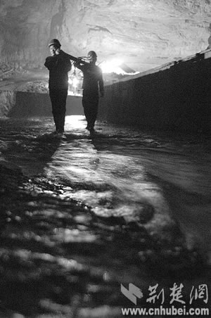 寂寞的蝙蝠第一次接待了人間來(lái)客,沉睡萬(wàn)年的巖溶洞穴第一次迎來(lái)了觀者。但黑暗陌生的世界還是讓堂堂男兒們感覺(jué)了一絲陰森恐怖。他們?cè)?tīng)當(dāng)?shù)匕傩諅髡f(shuō),洞里有巨蟒,所以至今沒(méi)人敢進(jìn)洞!白ゾo時(shí)間測(cè)量!”來(lái)不及恐懼,他們?yōu)樽约汗膭牛驗(yàn)檫@里隨時(shí)可能發(fā)生漲水、墜落等危險(xiǎn)?上В谝淮谓(jīng)驗(yàn)不足,手電筒的電池很快用完了,一行人只得互相攙扶著,摸索出溶洞!昂髞(lái),我們又進(jìn)去了7次,終于測(cè)出了暗河的具體位置和流向!狈轿奈湔f(shuō)。