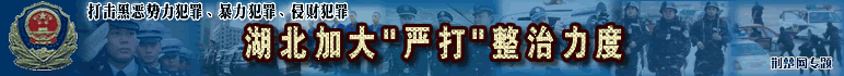 湖北今年嚴(yán)打目標(biāo)確定 省公安廳透露,去冬今春,我省社會治安大局穩(wěn)定,刑事發(fā)案率有所下降,今年將加大嚴(yán)打整治力度,重點(diǎn)打擊黑惡勢力犯罪、暴力犯罪、侵財(cái)犯罪……[詳細(xì)]::武漢警方突襲濱江明珠娛樂城 抓獲45名吸毒者 ::全省交警嚴(yán)查盜搶車 一假警車上查處9塊假車牌::湖北圈定106個(gè)治安整治重點(diǎn) 武漢市5個(gè)地段在列 武漢嚴(yán)打建筑工地惡勢力 [市政法委 各區(qū)舉報(bào)電話][把黑惡勢力趕出工地訪談熱線開通]::武漢市政法委副書記:廣泛發(fā)動群眾鏟除沙霸石霸::漢陽鏟除沙石惡霸團(tuán)伙 行兇兩年作惡無數(shù)(圖)