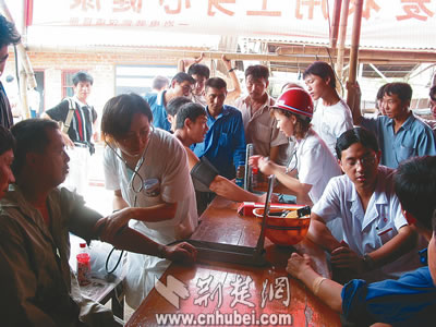 15日,參加武鋼工程建設(shè)的百余位農(nóng)民工兄弟,樂呵呵地接受了中國一冶電裝公司武鋼項目部為他們免費進行的體檢。浠水工程隊民工朱宗杰說:“這兩年來,社會各界對農(nóng)民工的關(guān)心很實在!