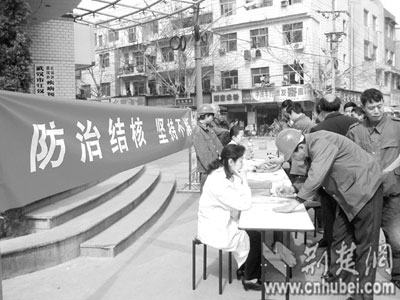 荊楚網(wǎng)(楚天都市報(bào))(記者 盧水平 通訊員 夏瓊 項(xiàng)征國 攝)昨日是世界防治結(jié)核病日,江漢區(qū)疾控中心為附近幾個(gè)建筑工地的280名農(nóng)民工,進(jìn)行免費(fèi)結(jié)核病透視篩查,結(jié)果發(fā)現(xiàn)5例可疑肺結(jié)核病人。據(jù)介紹,進(jìn)城務(wù)工者及流動(dòng)人口肺結(jié)核病患病率,高出市內(nèi)常住人口一倍,是目前城市結(jié)核病的重要傳染源。