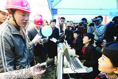 像譚梅一樣,昨天共有300多名農(nóng)民工涌到武漢市總工會大院,參加了在這里舉行的武漢市農(nóng)民工“平安返鄉(xiāng)”票務(wù)趕集會。在武漢市總工會組織下,漢口火車站、傅家坡長途汽車站、武漢港務(wù)集團(tuán)客運站等7家客運單位,紛紛來到趕集會現(xiàn)場,為農(nóng)民工提供熱情的票務(wù)服務(wù)。