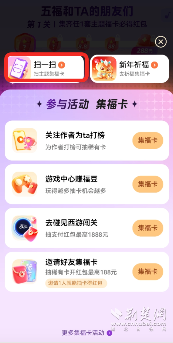 今年的集卡也比較多樣,除了經(jīng)典掃“福”字得卡,還可以掃所選IP主題的相關(guān)元素得卡,以“甄嬛傳”福卡為例,點(diǎn)擊“掃一掃”選擇“探五?!保瑢χ鐙?、皇后等人掃描后,都出了幾張不同的甄嬛傳系列里的???。同時,看視頻、碰一下支付也可以得卡。