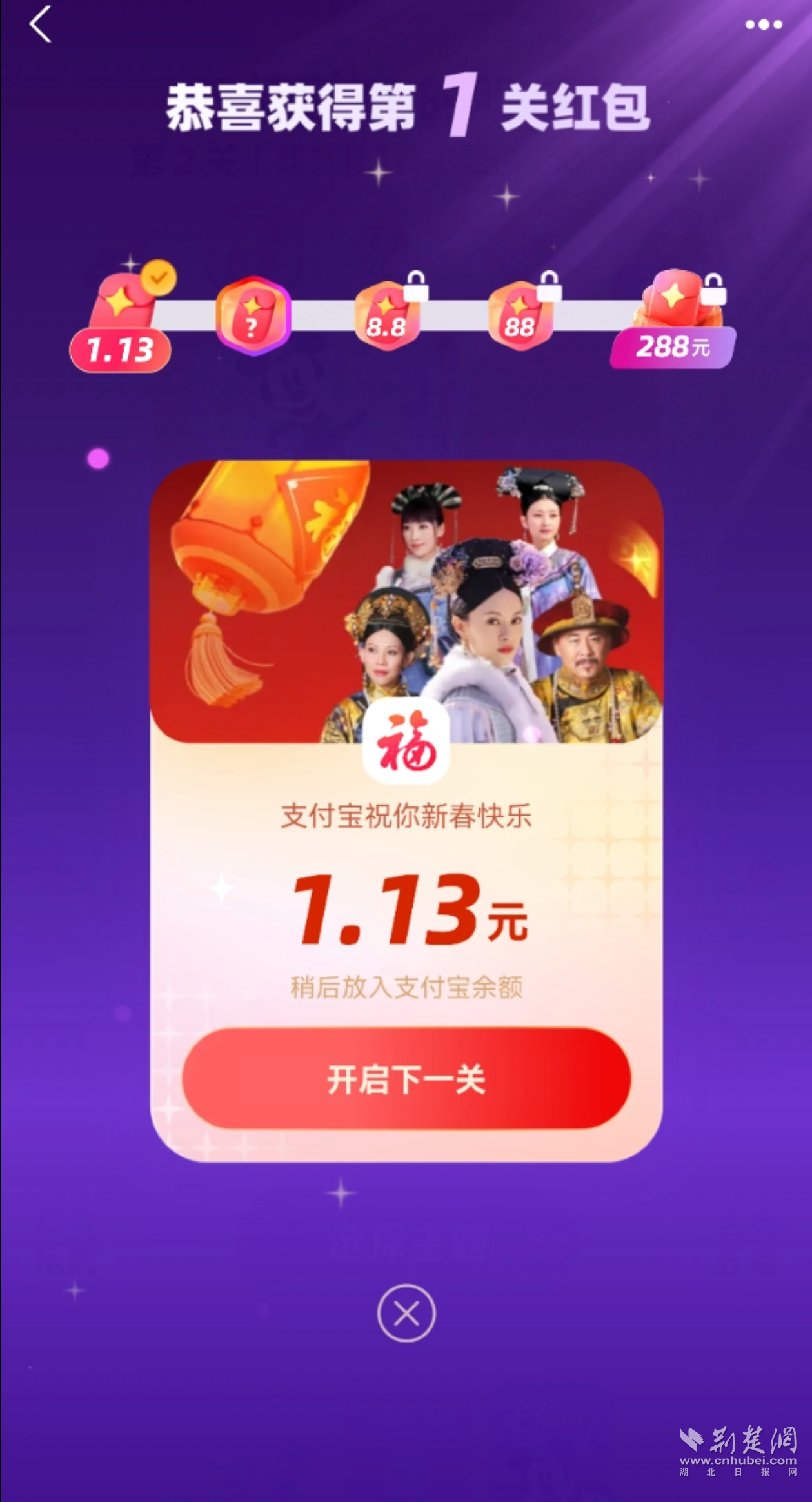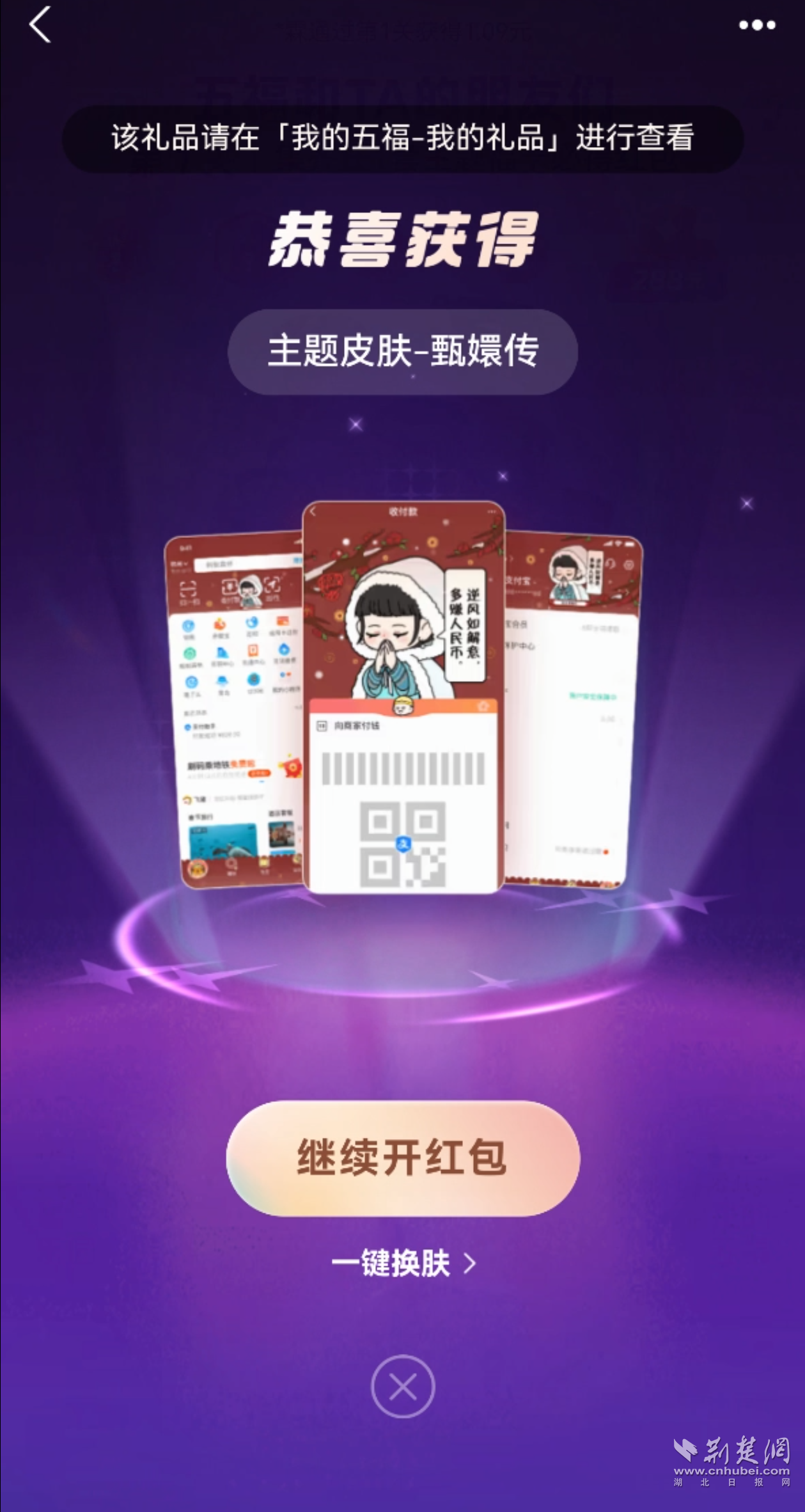 記者大約掃了六七次,就輕松集齊4張卡,合成后獲得了“甄嬛傳”主題的支付寶app的皮膚,領(lǐng)取紅包“開啟下一關(guān)”,則可以繼續(xù)闖關(guān)合成開獎。開獎不用等到除夕,并且可以一直集福到大年初五,這也是今年集福最大的變化之一。