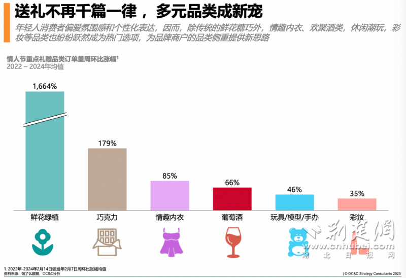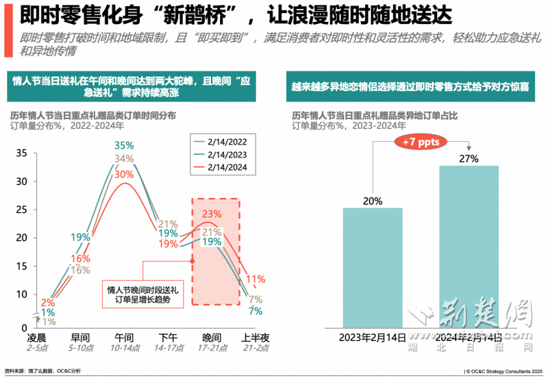 荊楚網(湖北日報網)訊(通訊員 易曄)元宵才過,情人節(jié)接檔。零售品牌商戶們毫不猶豫步入下一個生意高峰,過節(jié)的愛人們也不慌不忙在節(jié)日當天開始籌備浪漫表達。近日,餓了么聯(lián)合戰(zhàn)略咨詢公司OC&C共同發(fā)布的《情人節(jié)即時零售禮贈趨勢與品類機遇洞察》顯示,過去三年情人節(jié)當天,重點禮贈品類的外賣單量較12日環(huán)比增長超過3倍,且當日送禮訂單在晚間(17-21點)需求持續(xù)增長。