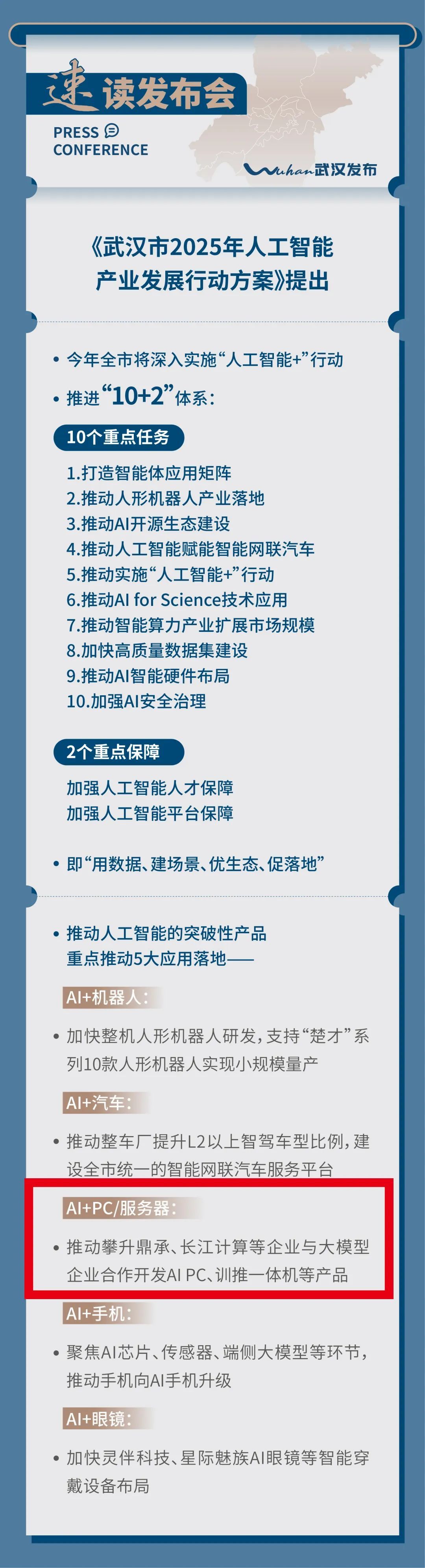 3月10日,《武漢市2025年人工智能產(chǎn)業(yè)發(fā)展行動(dòng)方案》新聞發(fā)布會(huì)召開(kāi)?!缎袆?dòng)方案》明確將“AI+PC/服務(wù)器”列為推動(dòng)人工智能的突破性產(chǎn)品,作為五大重點(diǎn)應(yīng)用之一予以落地,并點(diǎn)名支持攀升科技等企業(yè)聯(lián)合大模型廠商,攻關(guān) AIPC等產(chǎn)品。