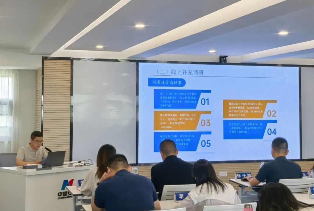“以新需求為導(dǎo)向,打造‘區(qū)級核心商圈+街區(qū)融合中心+社區(qū)特色網(wǎng)點(diǎn)’三級聯(lián)動商業(yè)布局,全面提升居民的生活品質(zhì)?!薄皩⒖萍汲晒D(zhuǎn)化、團(tuán)隊(duì)培養(yǎng)等指標(biāo)納入A、B和C類人才動態(tài)評價體系,探索‘區(qū)內(nèi)貢獻(xiàn)’與‘(人才)住房資源’的權(quán)重平衡機(jī)制”。結(jié)業(yè)式上,五組學(xué)員代表分別圍繞城市更新、AI技術(shù)賦能產(chǎn)業(yè)轉(zhuǎn)型、發(fā)展現(xiàn)代服務(wù)業(yè)體系、都市近郊農(nóng)業(yè)發(fā)展路徑探索和打造人才“引育留用”服務(wù)體系等主題,詳細(xì)匯報(bào)了本組調(diào)研成果,對相關(guān)領(lǐng)域存在的問題進(jìn)行深入剖析,提出了一些有借鑒意義的思考建議。