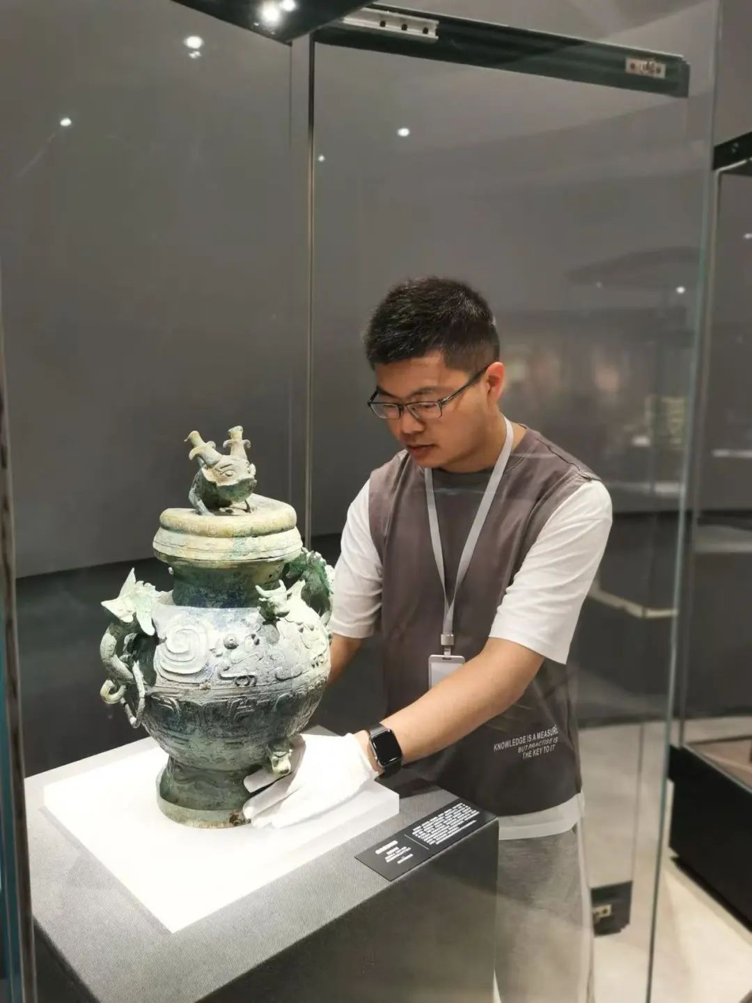 2021年6月,廖航在盤龍城遺址博物院開展“長江萬里青——長江流域青銅器精品展”布展工作