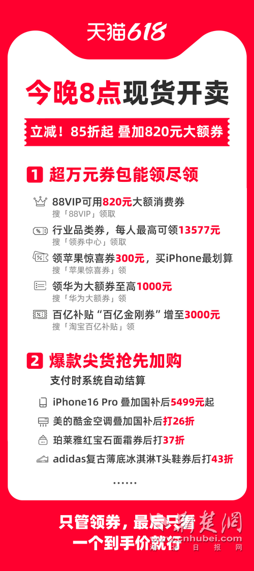 荊楚網(wǎng)(湖北日?qǐng)?bào)網(wǎng))訊(通訊員 朱飛)晚8點(diǎn),天貓618現(xiàn)貨開賣!