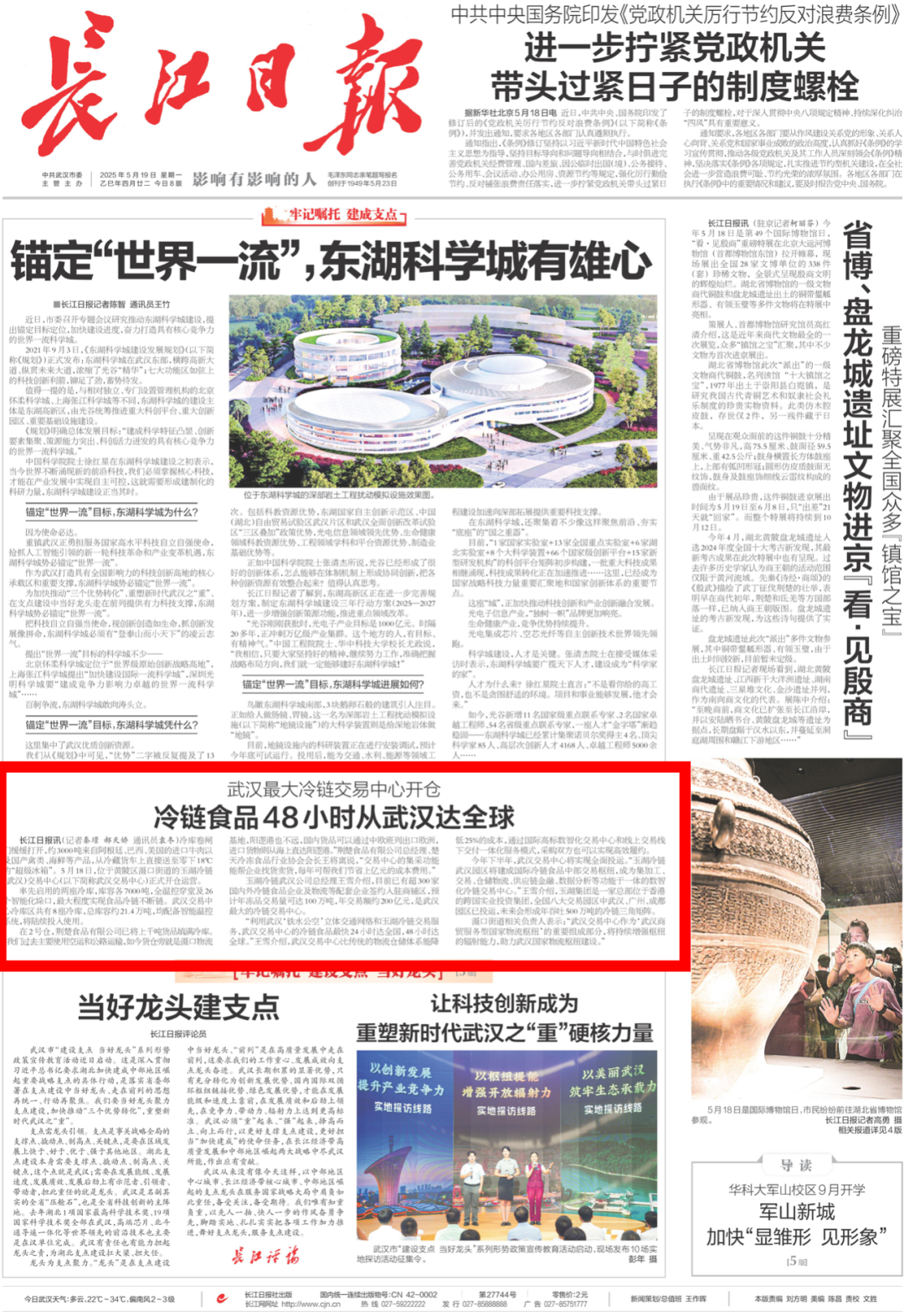 冷庫卷閘門緩緩打開,約3000噸來自阿根廷、巴西、美國的進口牛肉以及國產禽類、海鮮等產品,從冷藏貨車上直接送至零下18℃的“超級冰箱”。5月18日,位于黃陂區(qū)灄口街道的玉湖冷鏈(武漢)交易中心(以下簡稱武漢交易中心)正式開倉運營,這也是華中地區(qū)單體最大的冷鏈交易中心首倉。