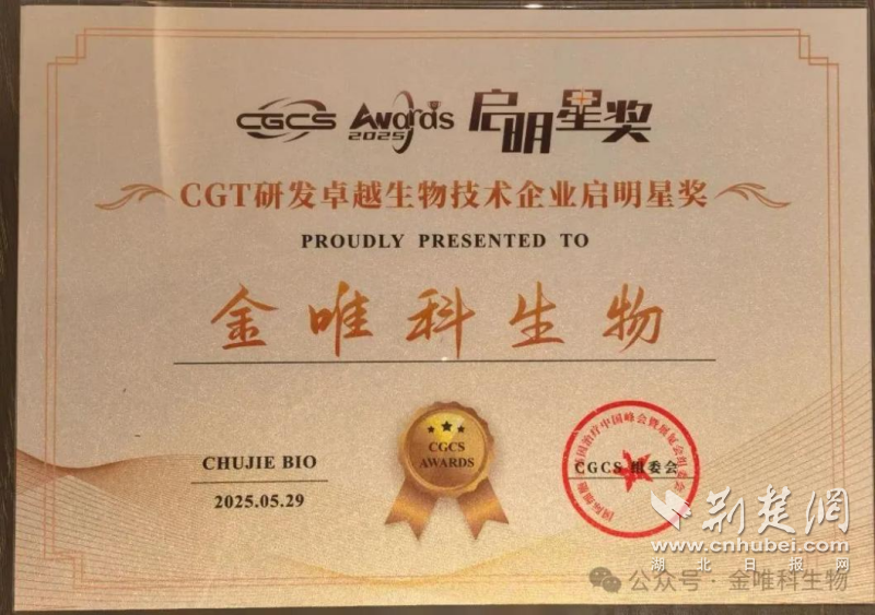荊楚網(wǎng)(湖北日報網(wǎng))訊(通訊員 董高宣)近日,第六屆國際細(xì)胞與基因治療中國峰會(CGCS 2025)在南京揚(yáng)子江國際會議中心召開,同期舉行了CGCS Awards“啟明星獎”頒獎盛典。東湖高新集團(tuán)投資企業(yè)武漢禾元生物科技股份有限公司(以下簡稱“禾元生物”)因優(yōu)質(zhì)的產(chǎn)品與服務(wù)榮獲“CGT領(lǐng)域可靠原料與試劑供應(yīng)啟明星獎”,另一投資企業(yè)成都金唯科生物科技有限公司(以下簡稱“金唯科”)憑借其在基因治療領(lǐng)域的創(chuàng)新成果榮獲“CGT研發(fā)卓越生物技術(shù)企業(yè)啟明星獎”。