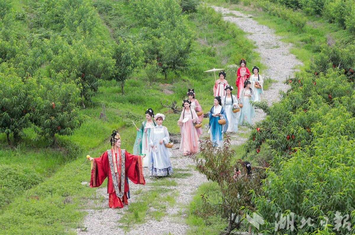6月10日,身穿漢服的演員在卓爾桃花驛小鎮(zhèn)的桃園里巡游。(湖北日?qǐng)?bào)通訊員 陳超 攝)