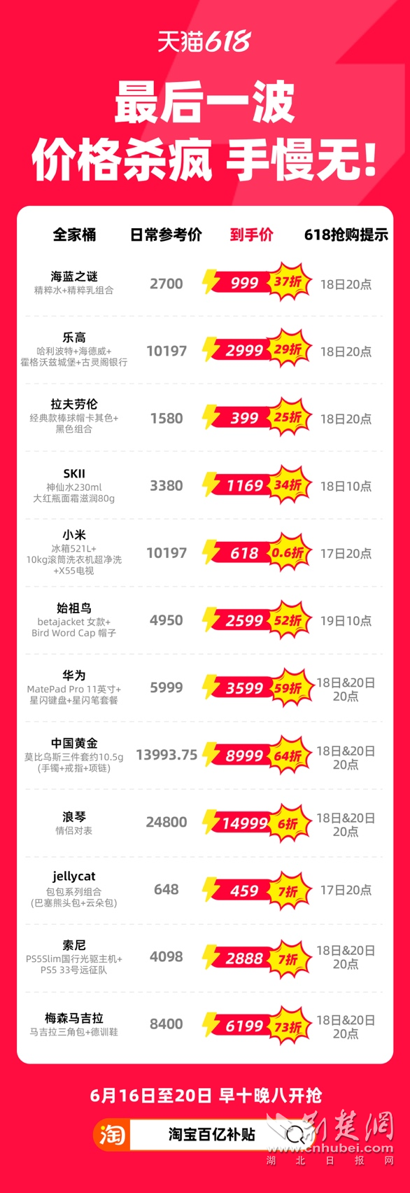 荊楚網(湖北日報網)訊(通訊員 朱飛)6月16日至6月20日,天貓618迎來最后一波瘋狂加碼。在官方立減85折基礎上,諸多權益都有不同程度的升級。