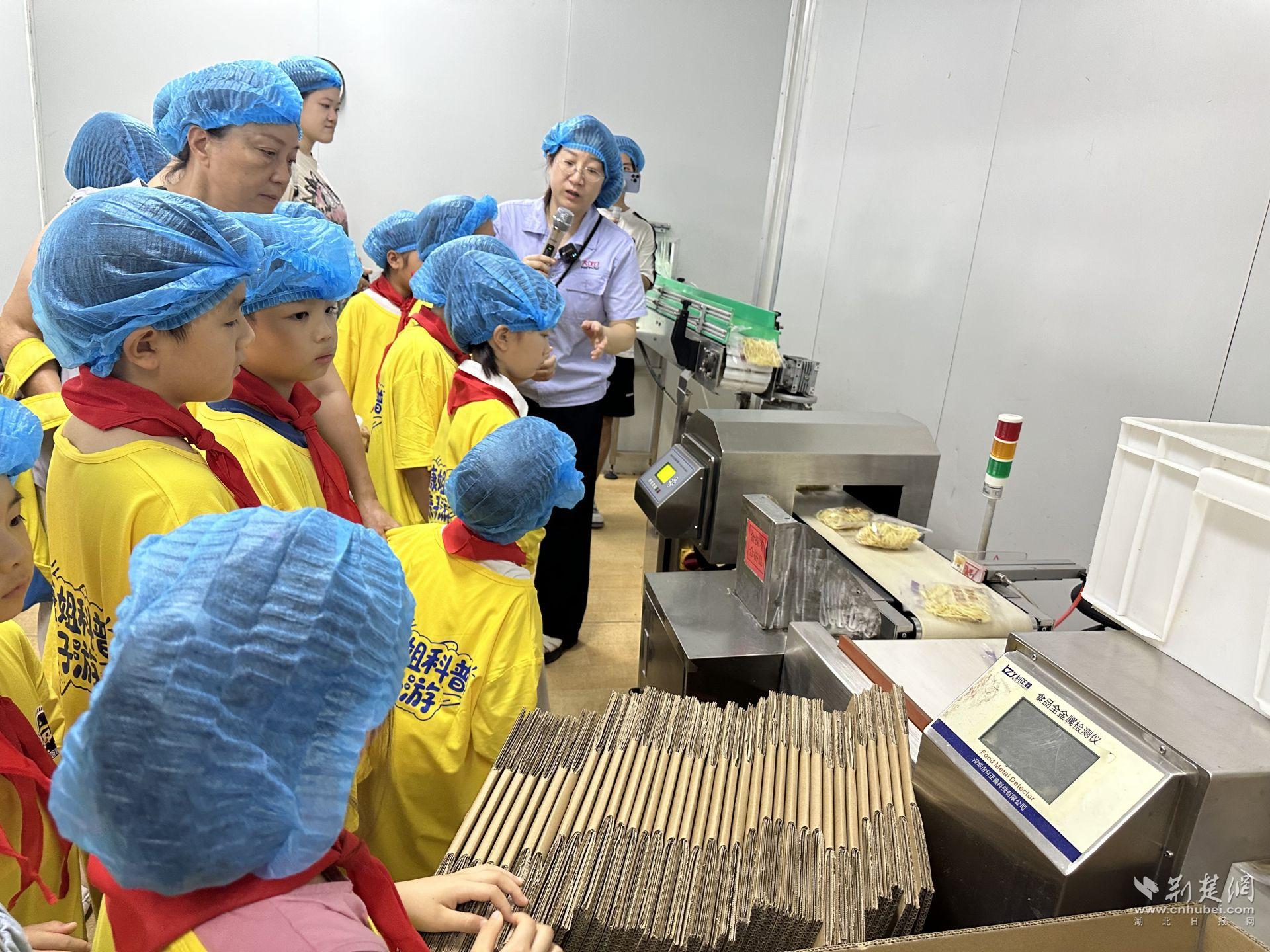 在熱干面生產(chǎn)車間,小朋友們透過(guò)玻璃窗,看到生產(chǎn)線上的熱干面源源不斷從傳輸帶送出來(lái),經(jīng)過(guò)食品袋密封,再被送到另一個(gè)車間包裝。