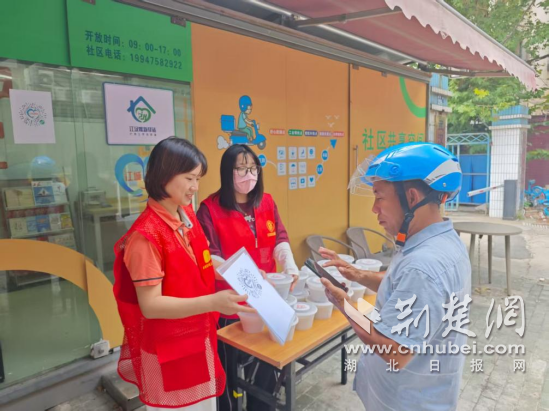 “師傅,喝瓶冰水,記得防暑啊?!被顒?dòng)現(xiàn)場(chǎng),紅馬甲志愿者將冰鎮(zhèn)礦泉水、藿香正氣液、降溫貼等防暑用品一一遞到外賣(mài)員、快遞小哥和環(huán)衛(wèi)工人手中。為了照顧騎手等餐時(shí)間短、流動(dòng)頻繁的特點(diǎn),社區(qū)提前將綠豆湯和糕點(diǎn)送至暖新驛站,實(shí)現(xiàn)“人找貨”變“貨找人”,當(dāng)天共為50多位戶(hù)外勞動(dòng)者送上了這份貼心清涼。