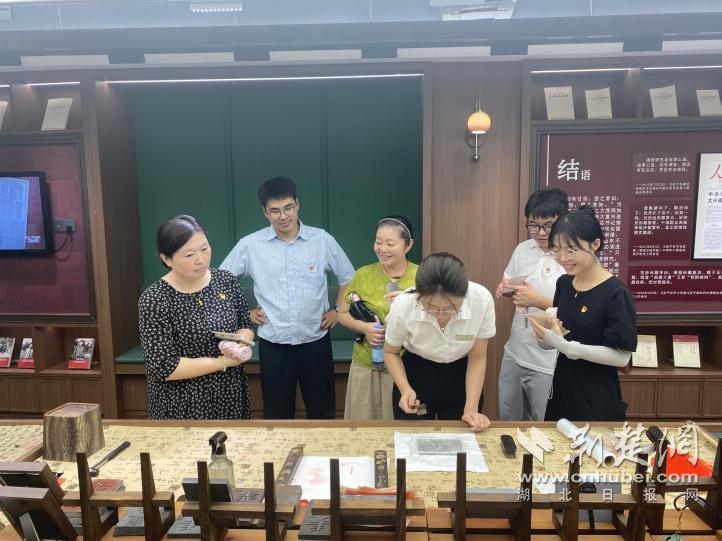在工作人員的講解中,黨員干部們深入了解了書店背后的故事,并親手參與了館內(nèi)拓印等非遺體驗項目。手掌與墨拓相遇的瞬間,大家仿佛穿越回那個戰(zhàn)火紛飛的年代,更直觀地感受到革命文化工作者的堅守與智慧。