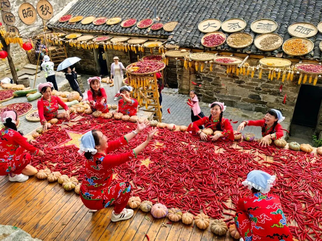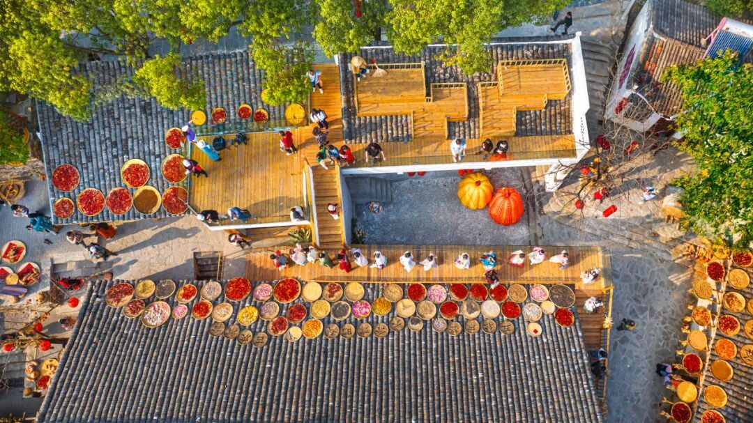 【豐收調(diào)色盤】登高遠(yuǎn)眺,整個(gè)古村宛如打翻的調(diào)色盤。辣椒紅、玉米黃、南瓜橙...在青瓦飛檐間鋪展成壯觀的豐收?qǐng)D卷。最佳攝影點(diǎn)已就位,等您收錄今秋最動(dòng)人的畫(huà)。