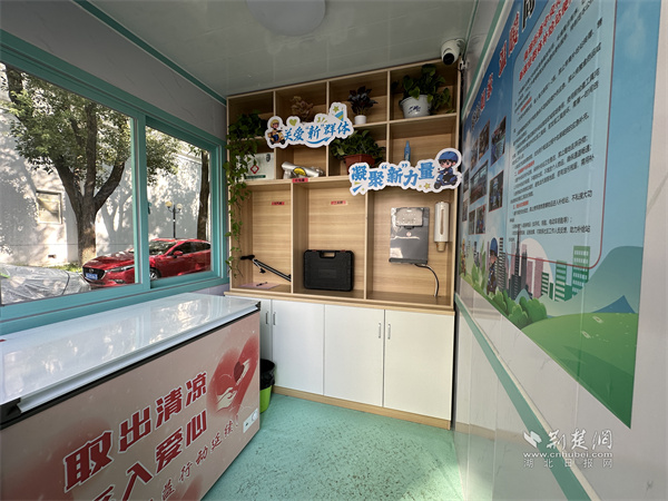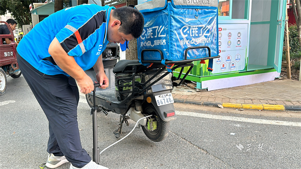 社區(qū)在北大門入口處設(shè)立的“暖心補(bǔ)給站”,成了小哥們的“能量加油站”。拉開(kāi)補(bǔ)給站的冰柜,冰爽的礦泉水整齊擺放;醫(yī)藥箱里,創(chuàng)可貼、碘伏、藿香正氣水等應(yīng)急藥品一應(yīng)俱全;維修工具箱和電動(dòng)打氣筒已幫十多位小哥解決過(guò)電動(dòng)車爆胎、零件松動(dòng)的難題;打包袋也方便了小哥臨時(shí)更換破損外賣包裝?!跋奶焖屯瓴?,來(lái)這兒取瓶冰水,渾身的燥熱都散了,心里也涼快!”快遞小哥王師傅邊說(shuō)邊拿起一瓶水,臉上滿是滿足。