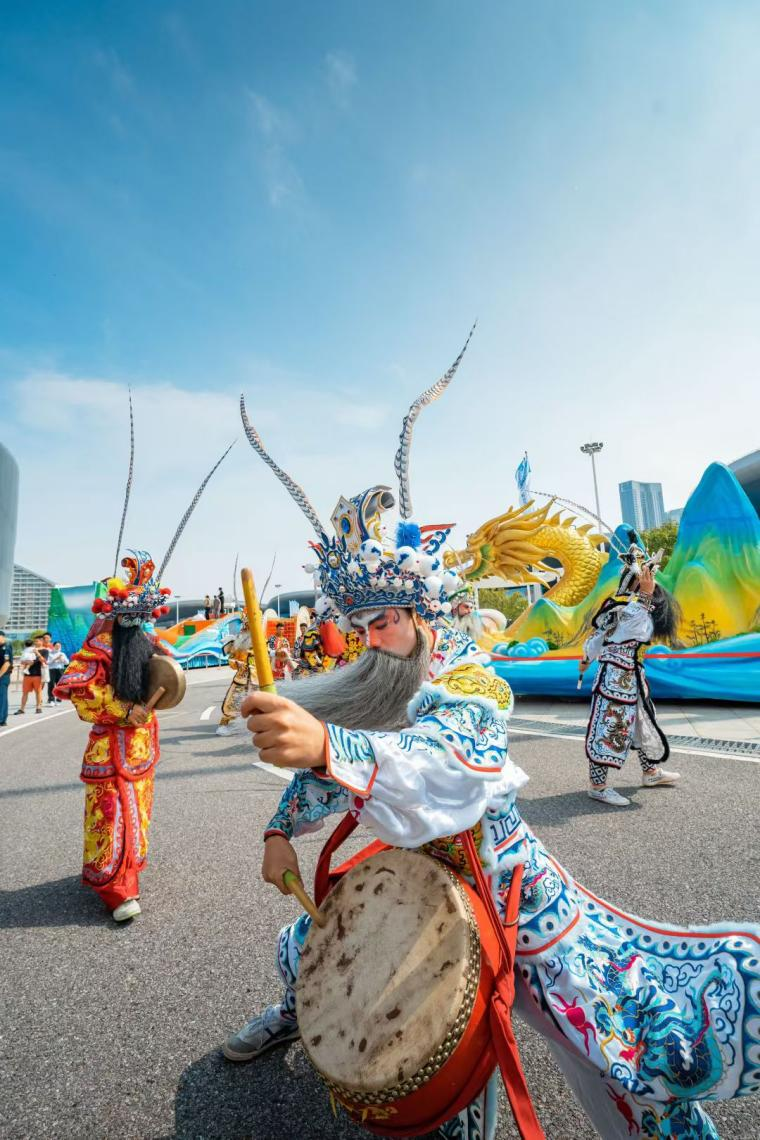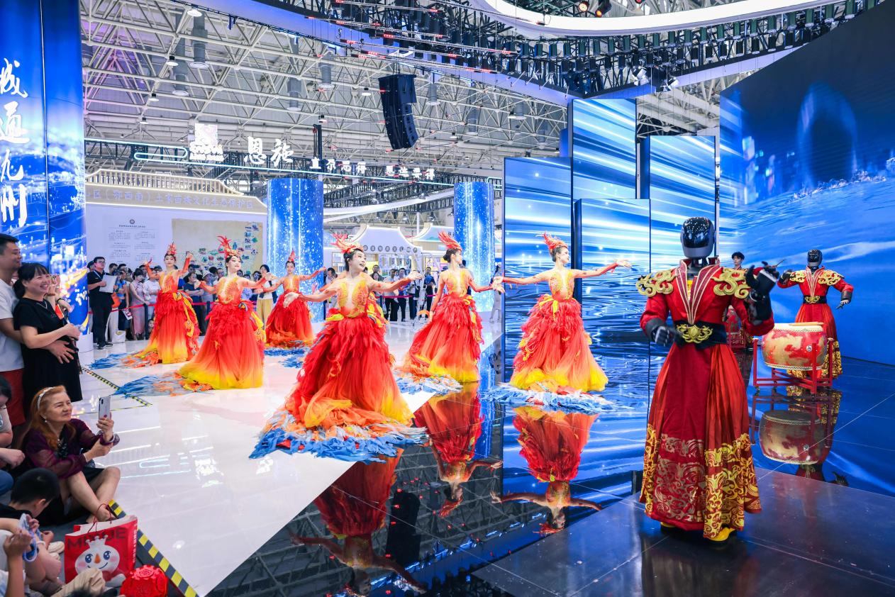 在展館內(nèi)外可以看到,各展區(qū)人頭攢動(dòng),在廣東長(zhǎng)隆展區(qū),兩點(diǎn)半的演出還沒開始,人流已經(jīng)里三層外三層打圍。伴著強(qiáng)勁律動(dòng),外籍演員們還邀請(qǐng)觀眾共舞互動(dòng),現(xiàn)場(chǎng)氣氛爆棚。展館內(nèi)部,韓國(guó)館、陜西館等展位的熱舞、非遺展演成了焦點(diǎn)。多種多樣的智能設(shè)備體驗(yàn)等,更成為小朋友的樂園。