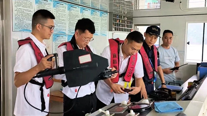 此外,無線電技術(shù)人員攜帶專業(yè)便攜移動監(jiān)測設(shè)備,對臨江坪待閘錨地區(qū)域開展水上移動電磁環(huán)境監(jiān)測;檢查船舶甚高頻電臺(VHF)等無線電設(shè)備,核查設(shè)備是否取得型號核準(zhǔn),檢測設(shè)備發(fā)射的無線電頻率、帶寬等技術(shù)參數(shù),排查通信安全隱患。