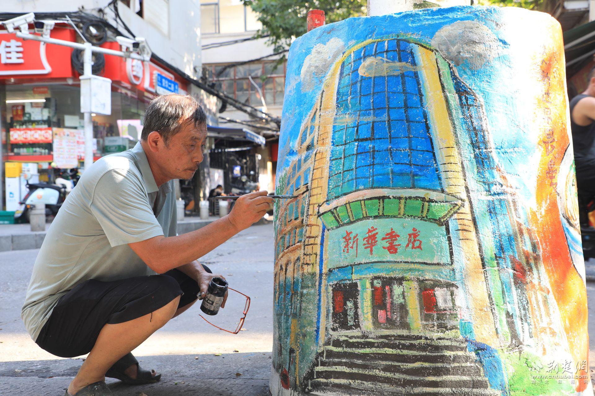 畢業(yè)于湖北美院雕塑專業(yè)的易小陽(yáng),年輕時(shí)就愛(ài)畫(huà)速寫(xiě)。退休后,他決定把老街巷當(dāng)畫(huà)布。半年時(shí)間,他義務(wù)繪制了120多處墻繪,總面積近500平方米。