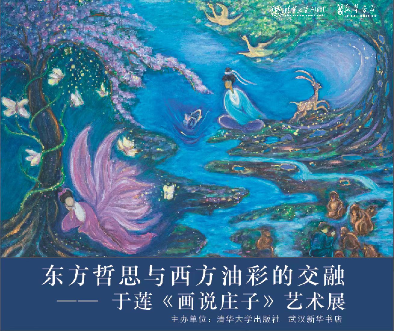 清華大學出版社特邀當代藝術家于蓮,耗時三年創(chuàng)作 27幅莊子主題油畫,以中西合璧的筆觸詮釋“天人合一”哲學。巨幅三聯(lián)畫《鯤鵬之變》用漸變的藍紫色調(diào)展現(xiàn)莊子的宏大宇宙觀,四聯(lián)畫《至樂》則以明麗色彩解構生死命題。