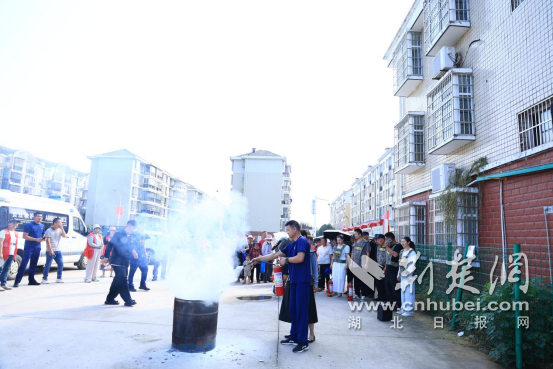 廣場一側(cè),先由湘口街道專職消防隊帶來一場沉浸式防災減災知識課。消防隊員就滅火器的性能、用途、使用方法、設備維護等基本知識進行講解,對如何正確使用消防栓、鋪設水帶進行了展示,著重講解了滅火器“一搖、二對、三撥、四壓”的操作技巧和注意事項,并指導社區(qū)居民進行滅火器實操演練。“以前覺得滅火器操作很難,掌握技巧一點不難!”參加實操的居民李大爺說道。
