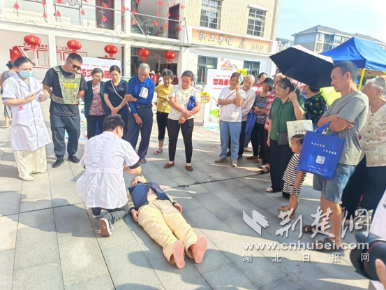 廣場另一側(cè),醫(yī)護人員鋪開模擬人體模型,演示燒傷包扎與心肺復蘇?!鞍惹鍧崅?,再用紗布從傷口下方往上層層固定,松緊度以能伸入一指為宜;做心肺復蘇時,按壓深度必須達5-6厘米,頻率保持每分鐘100-120 次,節(jié)奏就像跟著‘1001、1002’數(shù)數(shù)一樣均勻?!贬t(yī)護人員一邊說,一邊用手比劃著關鍵動作。講解完畢,邀請居民實操,遇到按壓角度偏斜、力度不足的情況,便俯身手把手糾正,耐心調(diào)整姿勢,確保每個人都能真正掌握正確要領。