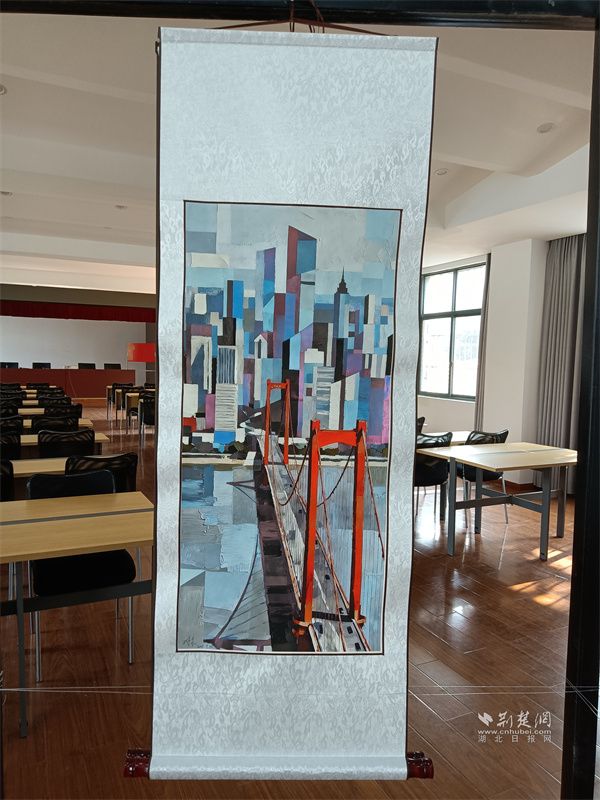 在成年人作品展示區(qū),一幅采用微噴打印技術(shù)的作品,采用色塊拼接的藝術(shù)手法,巧妙地將鸚鵡洲長(zhǎng)江大橋與密集的高層建筑群相結(jié)合,共同勾勒出現(xiàn)代都市的壯麗景觀(guān)。另外一幅作品以工筆勾線(xiàn)為基礎(chǔ),結(jié)合平涂與暈染技法,生動(dòng)呈現(xiàn)黃鶴樓下高速列車(chē)飛馳而過(guò)的畫(huà)面,實(shí)現(xiàn)了“古今”時(shí)空對(duì)話(huà)的獨(dú)特場(chǎng)景。此外,還有融合素描與水彩技法的作品,以寫(xiě)實(shí)風(fēng)格還原炭廠(chǎng)角省船宿舍的共享空間,傳遞出寧?kù)o院落的生活氣息?!敖窒镄骂佊吵?yáng)”和“鄰里情濃勝春暉”等書(shū)法佳作,以獨(dú)特的藝術(shù)形式彰顯了傳統(tǒng)文化的深厚魅力。