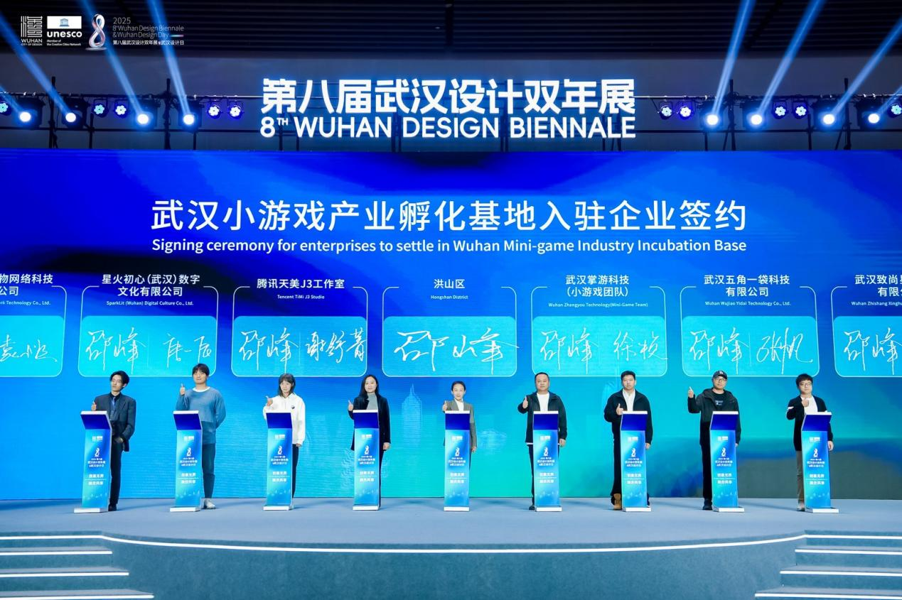 榮譽(yù)之外,產(chǎn)業(yè)合作是設(shè)計(jì)價(jià)值轉(zhuǎn)化的關(guān)鍵。開幕式現(xiàn)場,8家企業(yè)簽約入駐全國首家小游戲產(chǎn)業(yè)孵化基地——“武漢市小游戲產(chǎn)業(yè)孵化基地”,他們中既有充滿朝氣的新生代小游戲團(tuán)隊(duì),也有掌游科技這樣的行業(yè)領(lǐng)軍者,更有騰訊天美J3工作室等頂尖力量,他們將攜手打破行業(yè)邊界、共享資源平臺(tái),共同推動(dòng)數(shù)字創(chuàng)意產(chǎn)業(yè)與設(shè)計(jì)融合發(fā)展。