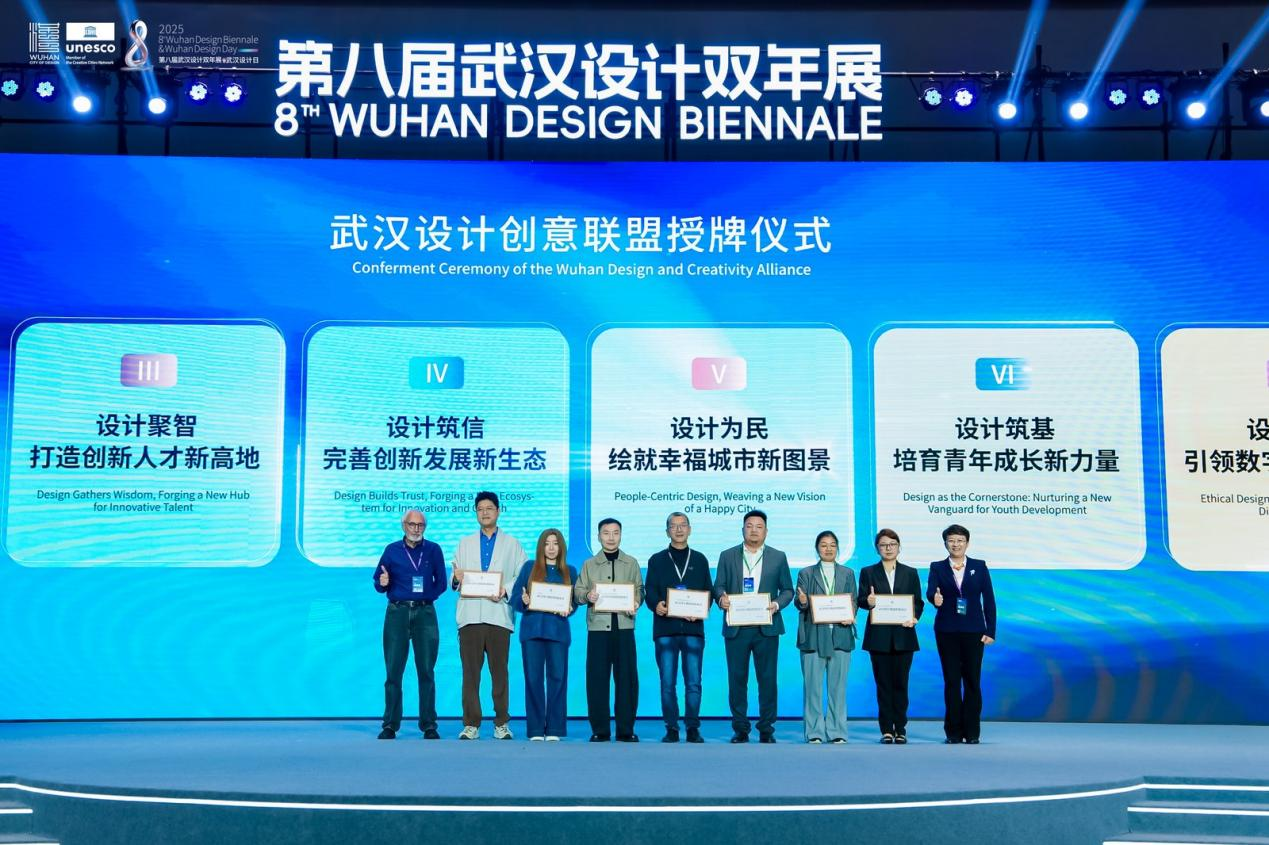 武漢有設(shè)計(jì)相關(guān)專業(yè)高校50余所,設(shè)計(jì)專業(yè)在校學(xué)生近10萬人,設(shè)計(jì)相關(guān)企業(yè)突破1萬家,10余個(gè)設(shè)計(jì)行業(yè)協(xié)會(huì),從業(yè)人員超50萬,形成了強(qiáng)大的“設(shè)計(jì)創(chuàng)意聯(lián)盟”,催生出了集產(chǎn)業(yè)鏈、創(chuàng)新鏈、人才鏈、價(jià)值鏈于一體的融合創(chuàng)新發(fā)展生態(tài)體系。在開幕式的最后,“武漢設(shè)計(jì)創(chuàng)意聯(lián)盟”正式授牌,來自設(shè)計(jì)企業(yè)、行業(yè)協(xié)會(huì)、高校院所和獨(dú)立設(shè)計(jì)師等領(lǐng)域多元設(shè)計(jì)力量代表共同見證。未來,“武漢設(shè)計(jì)創(chuàng)意聯(lián)盟”將奮力實(shí)現(xiàn)設(shè)計(jì)融城,構(gòu)筑協(xié)同發(fā)展新范式;設(shè)計(jì)賦能,激活產(chǎn)業(yè)升級(jí)新動(dòng)能;設(shè)計(jì)聚智,打造創(chuàng)新人才新高地;設(shè)計(jì)筑信,完善創(chuàng)新發(fā)展新生態(tài);設(shè)計(jì)為民,繪就幸福城市新圖景;設(shè)計(jì)筑基,培育青年成長新力量;設(shè)計(jì)向善,引領(lǐng)數(shù)字文明新航向;設(shè)計(jì)聯(lián)通,拓展國際交往新空間八大目標(biāo)。