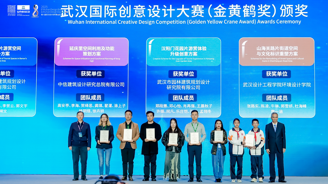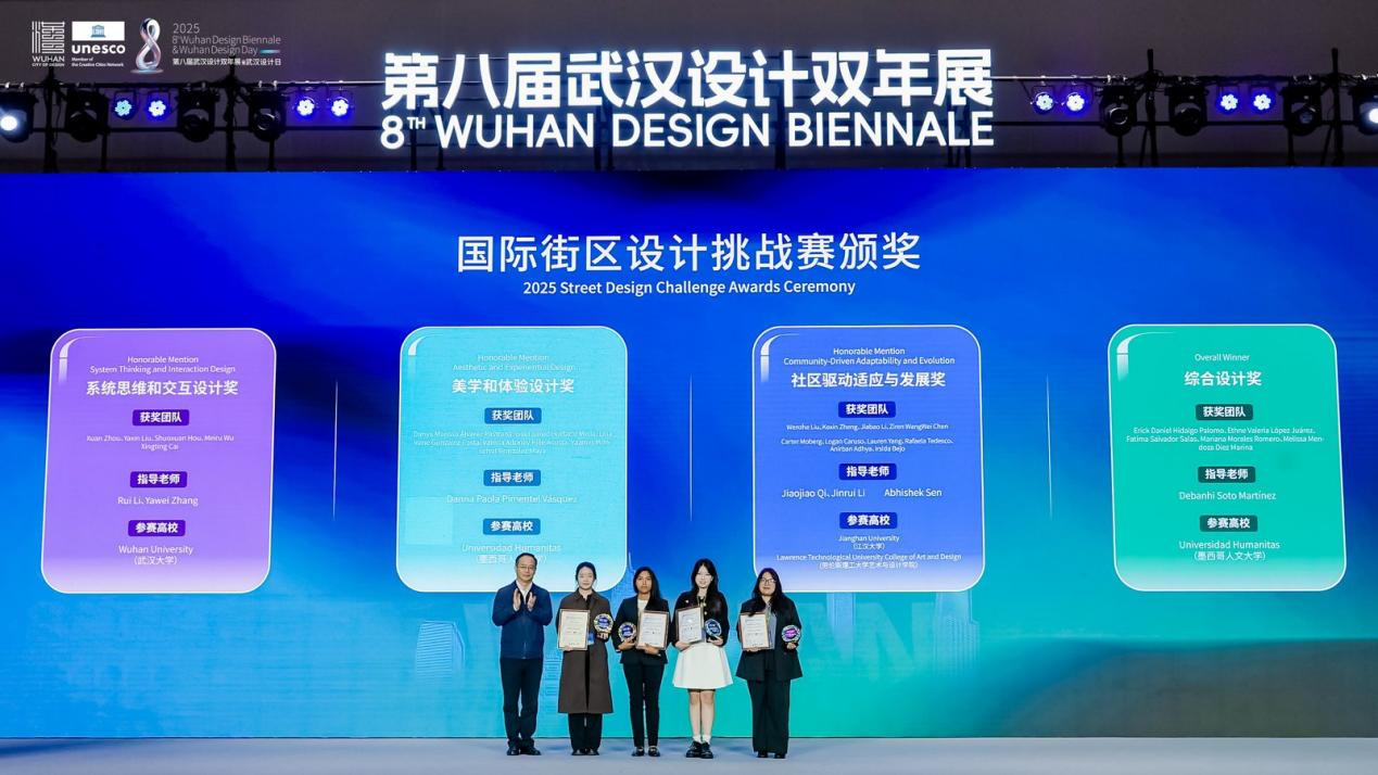 開幕式上,2025年武漢國際創(chuàng)意設(shè)計(jì)大賽(金黃鶴獎(jiǎng))與 2025年國際街區(qū)挑戰(zhàn)賽頒獎(jiǎng)儀式同步舉行。其中,象征武漢設(shè)計(jì)創(chuàng)新探索的“金黃鶴獎(jiǎng)”,今年特意選取黃鶴樓、山海關(guān)路、漢陽門等市民常去、關(guān)注度高、滿滿煙火氣的城市地標(biāo)作為設(shè)計(jì)對象,不限專業(yè)和地域,征集更宜人的更新提升方案?,F(xiàn)場,武漢瑞拓建筑設(shè)計(jì)咨詢有限公司等6個(gè)專業(yè)組一等獎(jiǎng)和最佳組織獎(jiǎng)武漢市七一華源中學(xué)等獲獎(jiǎng)代表接受頒獎(jiǎng)。國際街區(qū)挑戰(zhàn)賽,則是由聯(lián)合國教科文組織設(shè)計(jì)之都城市聯(lián)合舉辦,全球高校團(tuán)隊(duì)共同參與的國際設(shè)計(jì)賽事。經(jīng)過全球30位權(quán)威專家1個(gè)月的精心細(xì)致評(píng)審,選出了四個(gè)優(yōu)勝方案?,F(xiàn)場,為交互設(shè)計(jì)獎(jiǎng)獲獎(jiǎng)團(tuán)隊(duì)武漢大學(xué)、美學(xué)設(shè)計(jì)獎(jiǎng)獲獎(jiǎng)團(tuán)隊(duì)墨西哥人文大學(xué)、社區(qū)發(fā)展獎(jiǎng)獲獎(jiǎng)團(tuán)隊(duì)江漢大學(xué)團(tuán)隊(duì)和美國勞倫斯理工大學(xué)團(tuán)隊(duì),以及綜合設(shè)計(jì)獎(jiǎng)獲獎(jiǎng)團(tuán)隊(duì)墨西哥人文大學(xué)頒獎(jiǎng)。