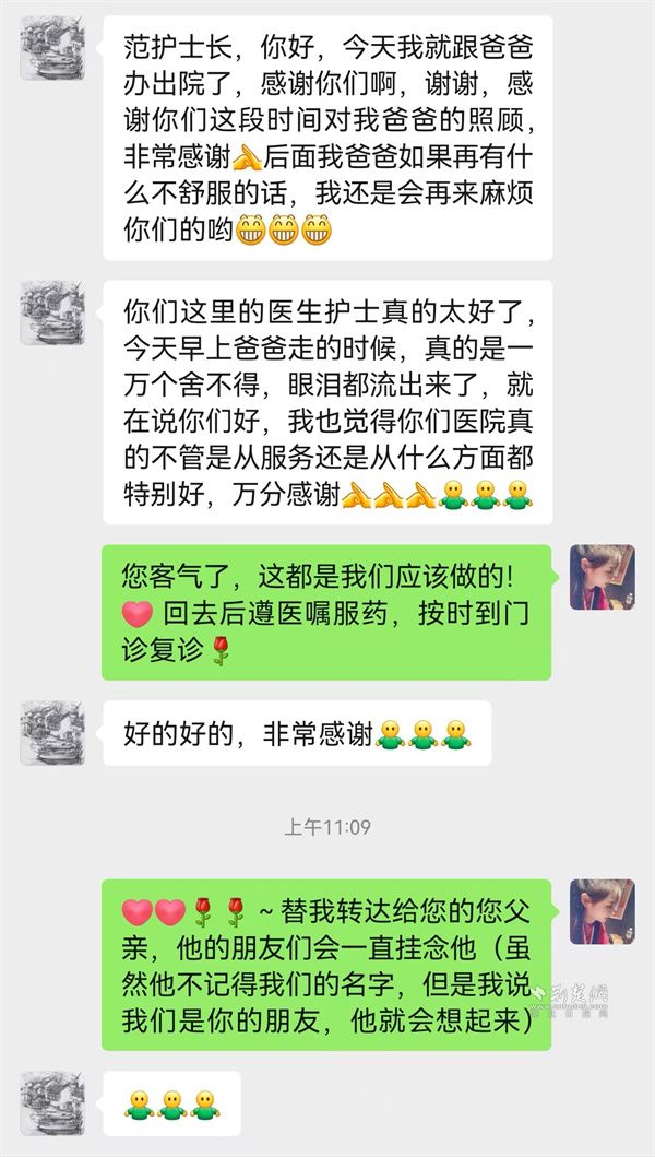 這份細(xì)致關(guān)懷,也深深印在患者和家屬心里?;颊卟痰鲈呵?,女兒特意給副護(hù)士長范美玲發(fā)來微信:“你們這里的醫(yī)生護(hù)士真是太好了,爸爸在這住得比家里還舒心,你們比親人還細(xì)心。今天早上離開的時(shí)候,他一萬個(gè)舍不得,反復(fù)念叨著不想走?!?/p>