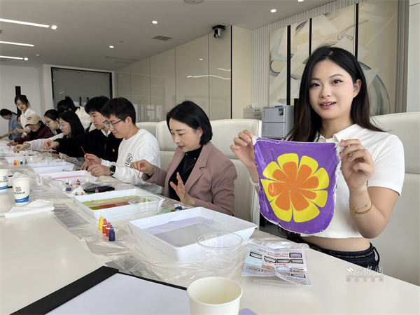 非遺手工絲巾水拓畫制作環(huán)節(jié),專業(yè)老師首先向黨員們介紹了絲巾水拓畫的歷史和制作技巧。在老師的指導(dǎo)下,黨員們紛紛拿起工具,發(fā)揮創(chuàng)意,將顏料滴入水中,通過(guò)輕輕攪拌和吹拂,讓顏料在水中自然暈染形成紋理后,將絲巾輕鋪在水面,色彩瞬間滲透,一幅幅絢麗的圖案便印染在了絲巾上。大家還邊制作邊交流討論,互相展示染好的作品,歡聲笑語(yǔ)不斷。