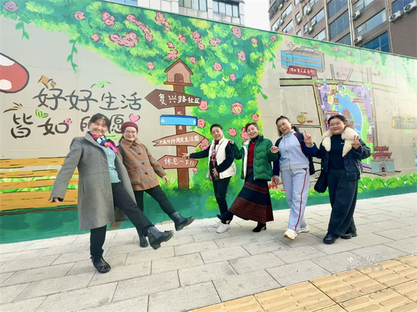 “復(fù)興時(shí)光里”特色手繪墻成現(xiàn)場打卡熱點(diǎn),墻上不僅繪有社區(qū)特色地圖與“十五分鐘生活圈”元素,還承載著居民的共同記憶,為社區(qū)文化建設(shè)添上靚麗一筆,成了鄰里溫情與社區(qū)活力的見證。