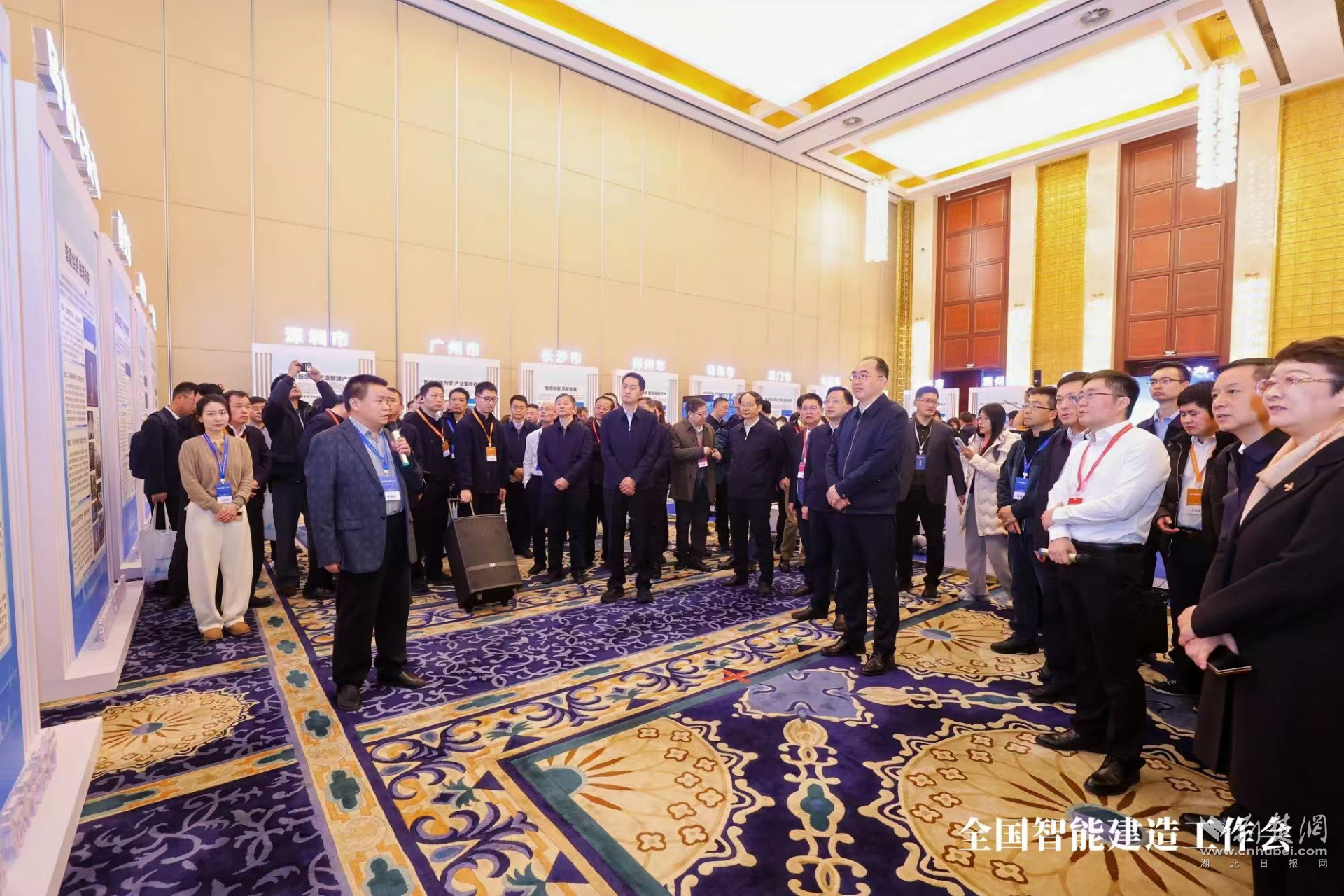 會前,與會代表集中觀摩了全國智能建造試點城市成果展。在參觀武漢市智能建造三年成果展板時,住房城鄉(xiāng)建設部副部長李曉龍認真聽取了武漢市關于“科技+產業(yè)+人才”一體化發(fā)展新模式及智能建造新生態(tài)建設情況的匯報,對武漢在推動建筑業(yè)轉型升級方面的實踐成效給予了充分肯定。