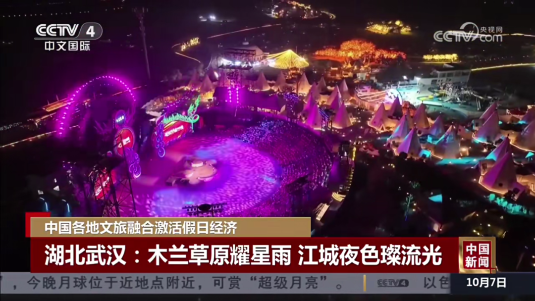 10月7日:CCTV-4《中國新聞》聚焦報道黃陂木蘭草原文旅融合激活假日經(jīng)濟(jì):木蘭草原耀星雨,江城夜色璨流光。