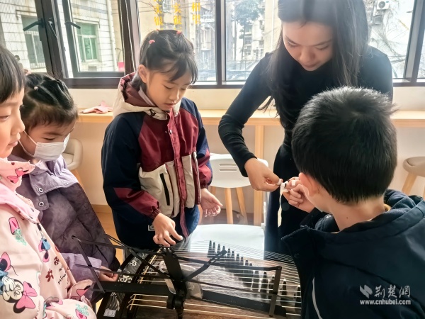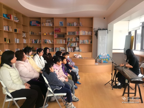 當天上午,黃鶴書房內(nèi)箏聲潺潺,以“琴潤書香遇知音”為主題的古箏生活美學雅集在這里上演。二十余位居民齊聚一堂,在專業(yè)老師的帶領(lǐng)下,共同走進古箏的悠遠世界。