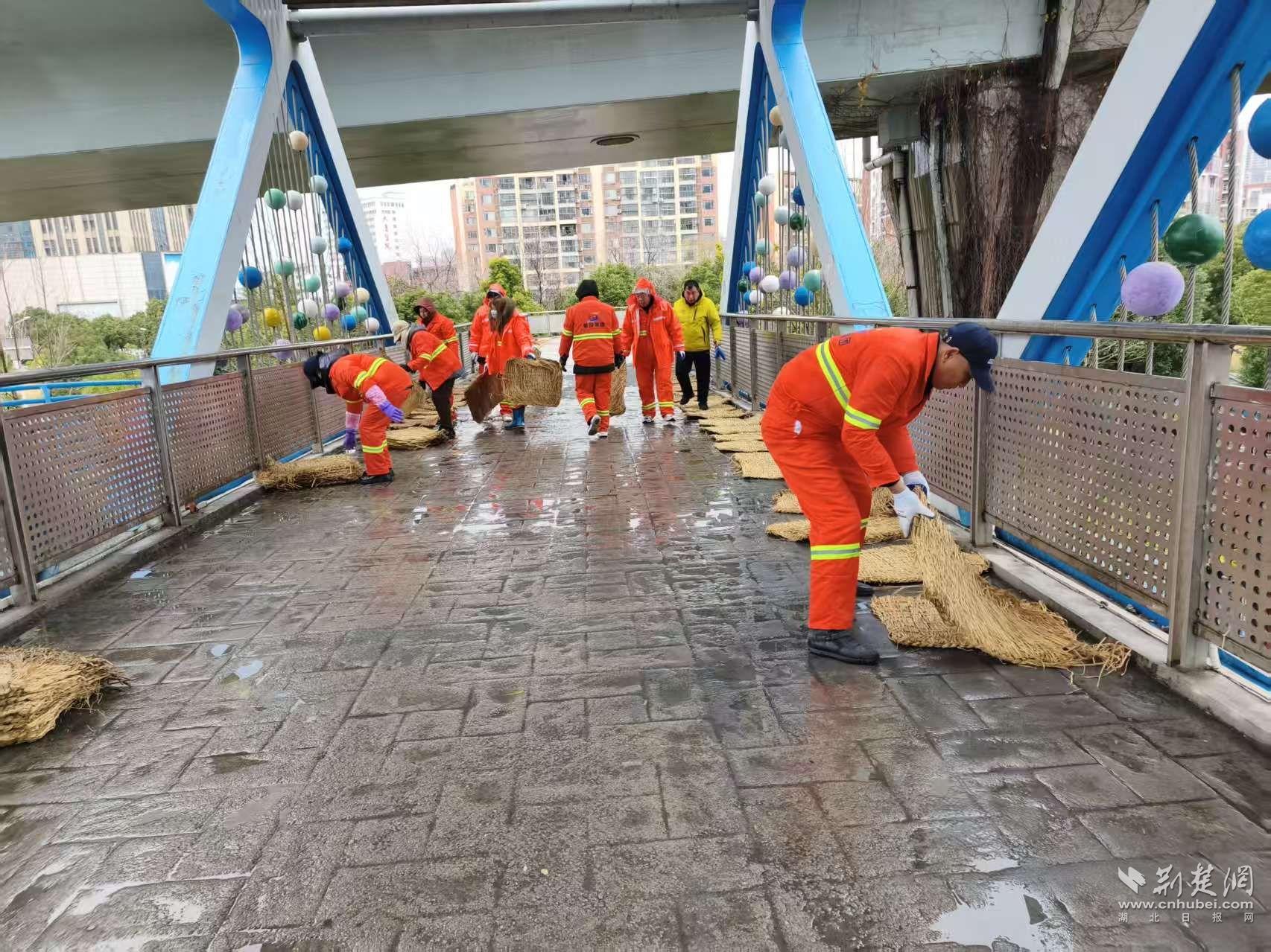 防滑措施同樣向行人集中區(qū)域延伸。19日17時起,吳家山環(huán)山路人行天橋上,環(huán)衛(wèi)工人與執(zhí)法隊員開始鋪設(shè)防滑草墊?!皹騼蓚?cè)是學校,晚高峰和早高峰人流集中,提前鋪設(shè)能減少滑倒風險?!眳羌疑浇志C合執(zhí)法中心副主任陳偉說。