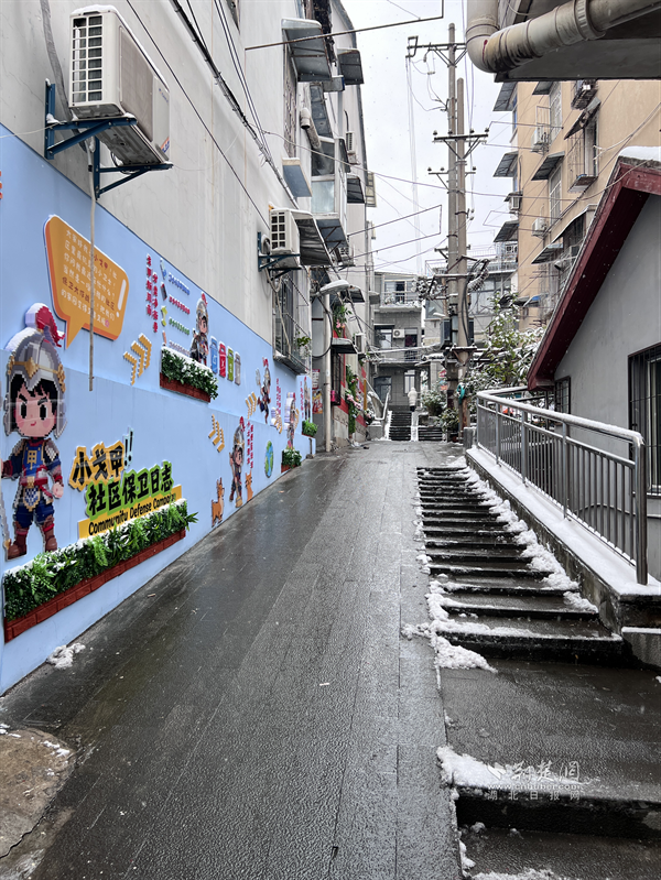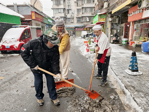 20日清晨,糧道街胭脂路部分路段冰雪堆積,步行、車行存在安全隱患。沿街商戶主動設(shè)立板凳、雪糕筒提醒路人繞行,并拿起掃把清掃路邊積雪,方便路人安全通過?!斑@是武漢的第一場雪,雖然很美,但路滑容易摔跤,我們早點把門口掃干凈,大家走路就放心了?!币晃簧虘衾习逡贿吂讱庖贿呎f道。這一把把掃帚不僅掃去了積雪,更暖了人心,商戶們用最樸實的行動,在寒冬街頭筑起了一道溫暖的安全防線,展現(xiàn)了“社區(qū)是我家”的主人翁精神。