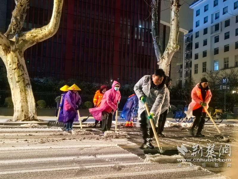 20日凌晨30分,武昌區(qū)中華路街道迅速組織力量,街道、轄區(qū)應(yīng)急分隊、環(huán)衛(wèi)工人、物業(yè)以及社區(qū)志愿者等80余人,連夜對中華路、解放路、民主路、都府堤路等重要干道展開連夜作業(yè);凌晨5時,洪山區(qū)執(zhí)法中心組織力量對文治街、書城路沿線長達(dá)1.2公里的人行道展開"地毯式"清障,累計清除積雪積冰約2000平方米;早上6時,江岸區(qū)花橋街道380余人的除雪隊伍集中對校園周邊、小區(qū)出入口、主干道人行道的積雪進(jìn)行重點清掃,累計清理積雪約0.8噸。
